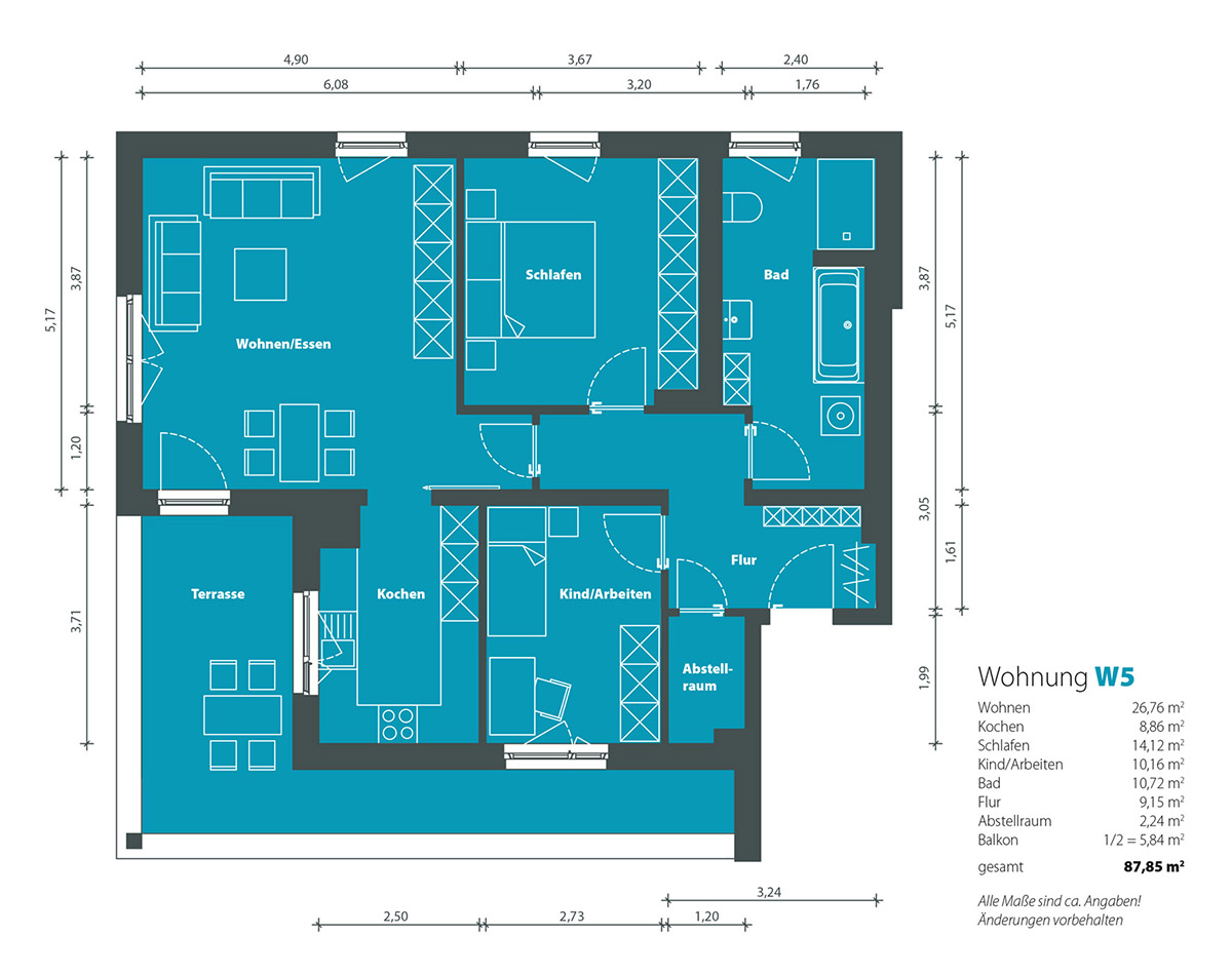 Helle Räume mit Fußbodenheizung, modern ausgestattete Bäder, hochwertige Boden- und Wandbeläge und viele weitere Annehmlichkeiten sorgen für eine besondere Attraktivität der Wohnungen. Große Balkone oder Dachterrassen und Abstellräume auf den Etagen ergänzen die modernen und offenen Grundrisse. Alle Wohnungen sind barrierefrei.